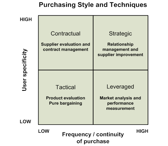 Figure 1 sets out different purchasing styles and techniques for the four quadrants of a 2×2 matrix. On the vertical axis is user-specificity – i.e. the uniqueness and customer-specific nature of the requirement – on the horizontal axis is the repetitiveness or continuity of requirement.
